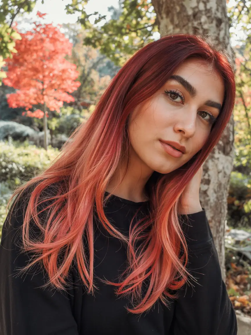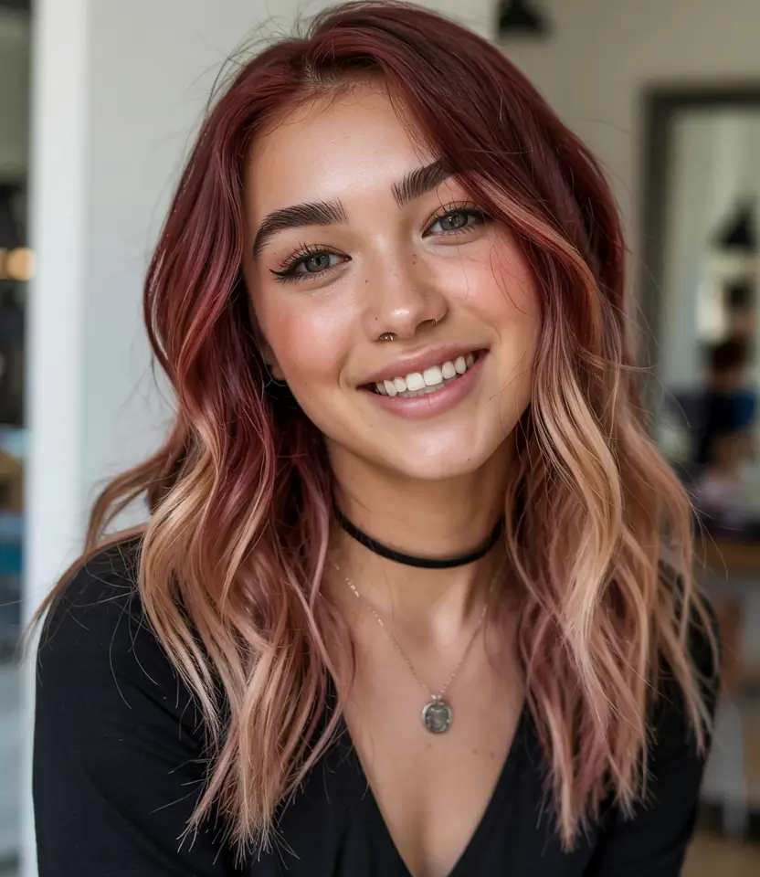 The ombre begins with a dark burgundy base and gradually transitions through peachy pinks to the ends, creating a soft gradient filled with inviting warmth. The face is delicately framed by the softly applied layers that give the look a soft, dynamic movement. The style serves medium-length women who want to explore feminine shades because of its stunning appearance. The mix creates a magical effect that shines perfectly in the sunlight.