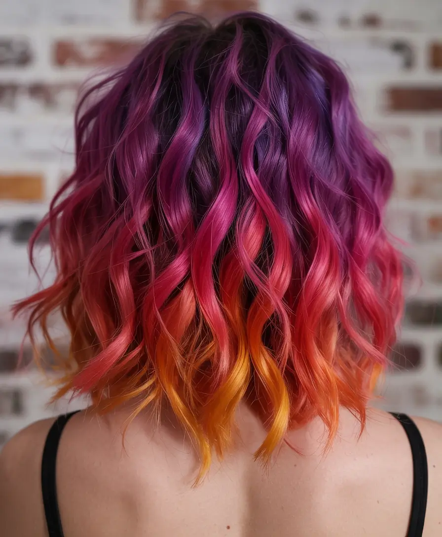 The multi-color gradient of this style features deep purple on the bottom, which transitions to pink before revealing its final glow of orange and golden ends. Shaped waves enhance the separation of each hue from the rest of the hair. This aggressive ombre transformation features color trends that will be popular in summer 2025. This colorful hairstyle creates a bold visual appeal by not hiding any color intensity.
