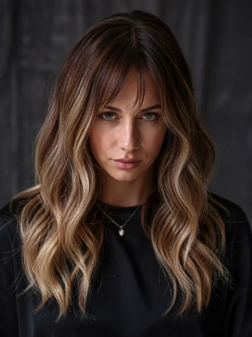 The seamless ombre transition takes dark brown hair seamlessly to soft blonde tones in a fashionable way. A modern face shape is created with curtain bangs that help balance the layered waves. This style appeals to people who want soft, medium-length hair. A versatile, timeless option that is ideal for both casual and formal looks.