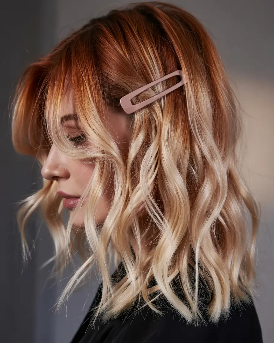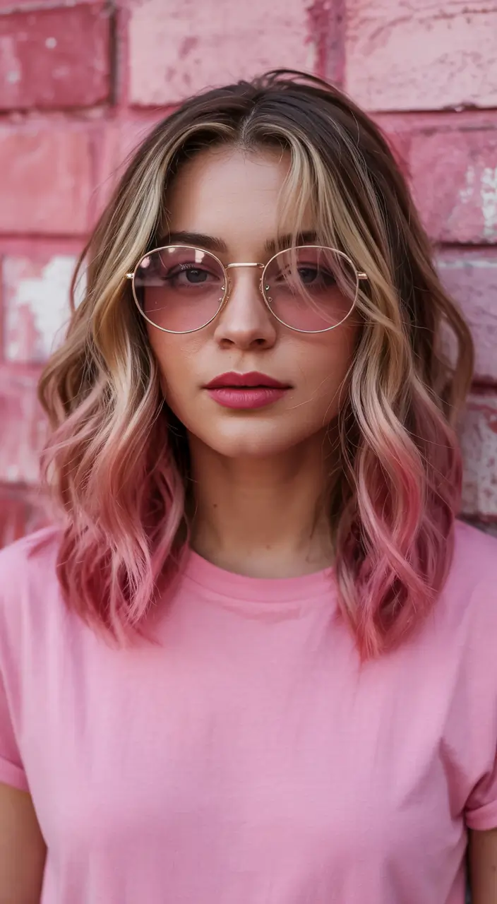 This fashion-forward hair color presents a warm blonde foundation before transitioning to a playful pink as it freezes. Soft waves frame this shoulder-length cut for a fresh, energetic look. The look works well for those looking for dramatic hairstyles that avoid excessive intensity. This unique ombre hair concept showcases summer 2025 trends through its appealing, individual look.