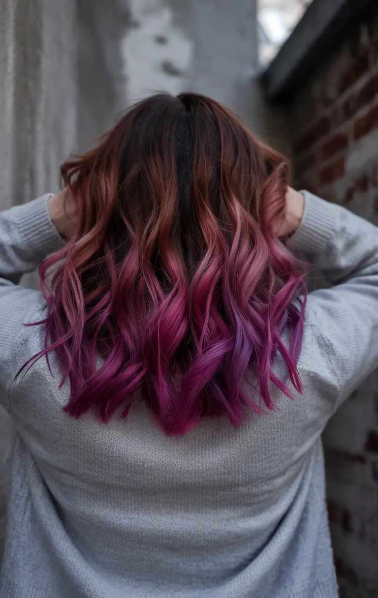 This daring style begins with deep brown hair that transitions smoothly into bright pink raspberry and ends in vibrant violet tones. The well-defined curly waves enhance the depth of color and add body to each shade. This vibrant color sequence creates an unforgettable look that satisfies those who desire innovative hairstyles. A distinctive style makes this cut suitable for layers of varying lengths from medium to short.