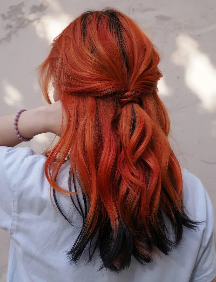 A strong, dramatic color that combines fiery red and orange midtones with all-black ends. The soft half-up twist showcases the different tones separately by highlighting their contrasting appearance throughout the hair. A fearless and edgy look for those looking for something different this season. The artful black and summery colors allow for eye-catching expressions.