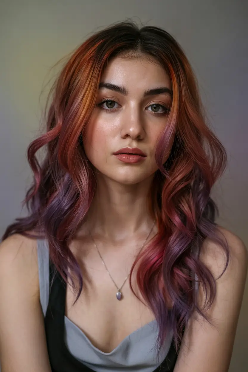 The distinctive coloring in this style transforms red and copper sunset hues into purple throughout the length of the hair. Soft, flowing waves enhance both the transitional color depth and the dramatic effect, creating an elaborate yet practical highlighting and lowlighting effect. The look is perfect for women who prefer unique color finishes with individual character. The ideal length for this look is medium-length hair, as it provides the ideal balance for versatility.