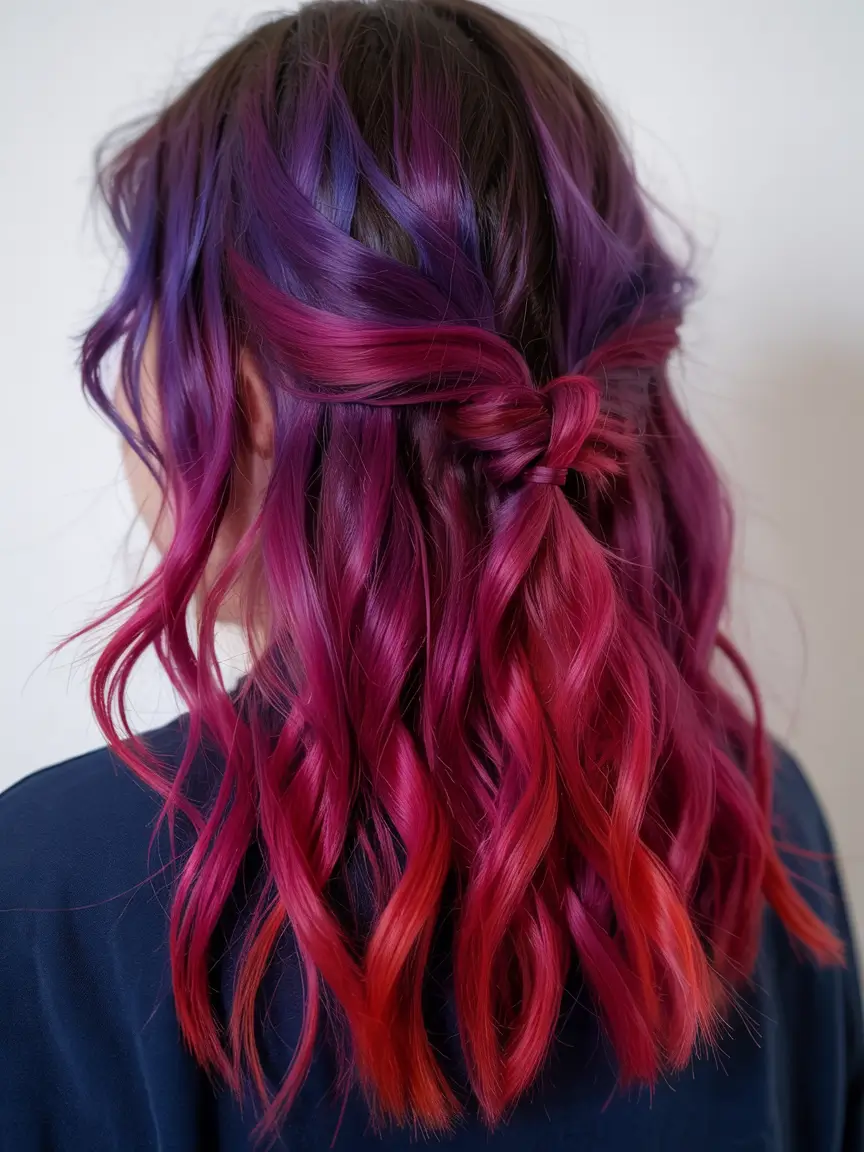 The deep purple roots transform into a combination of rich magenta and fiery red, brought together by the weaving process of a half-up twist. Under bright lighting, the reflective finish enhances the vibrancy of these hues. The style shows a bold artistic spirit by blending artistic expression with bold personality. People choose this hairstyle as their summer expression either by wearing braids or using natural colors for intriguing styling.