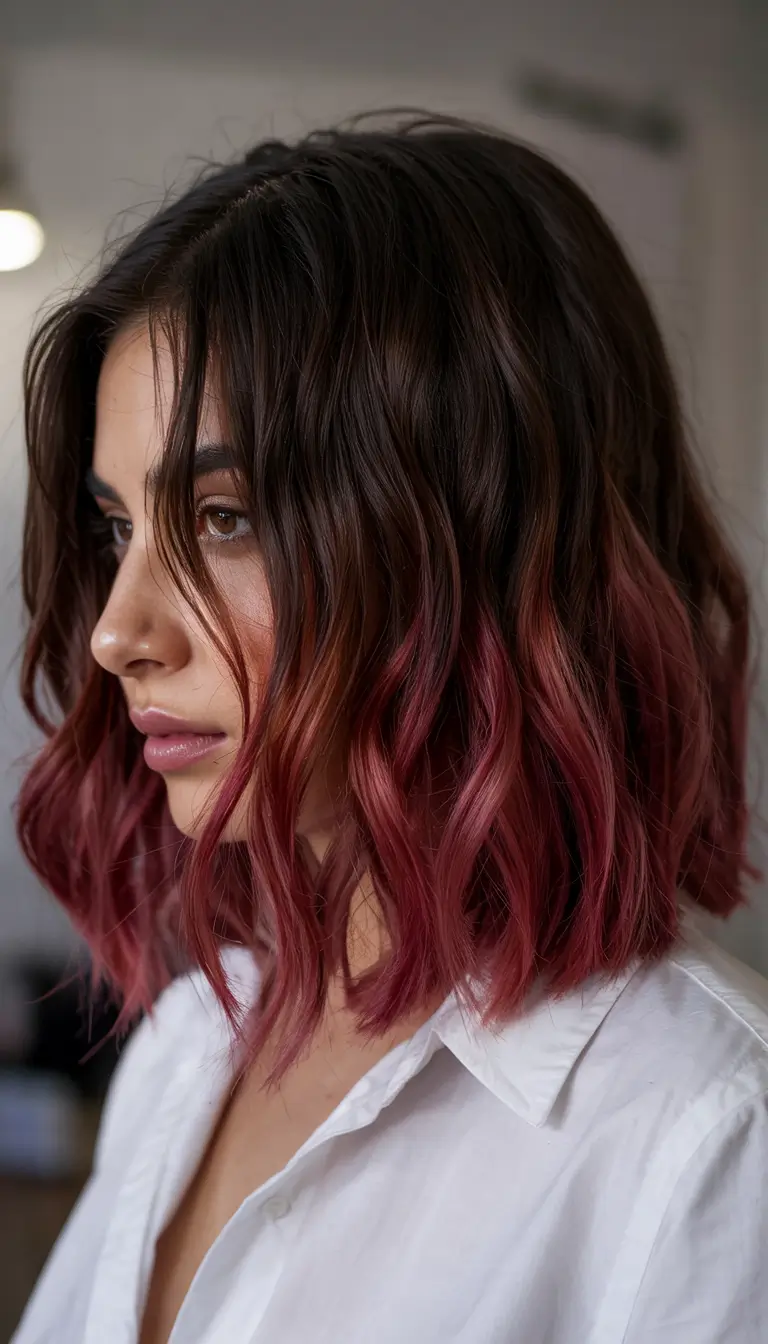 The distinctive coloring transitions from dark brown roots to rich berry ends, creating a graduated effect for those who want bold yet elegant results. A short layered cut retains natural waves, resulting in a texture that looks as if it has grown on its own. Short and brunette hairstylists looking for a distinctive look should consider this style. The dark to red coloring creates both urban rebellion and summer wearability.