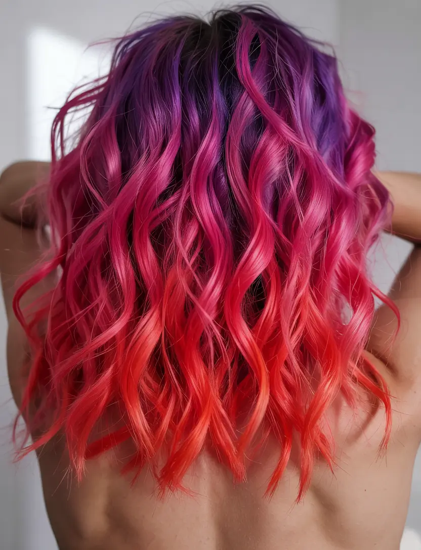 A dramatic presentation of colorful artistic expression, these purple roots transition to hot pink and fiery coral ends as they mimic a perfect sunset. The precise curl shape accentuates each hue while making it visible to the eye. The appeal of this color style is for individuals seeking fashionable summer 2025 ombre variations. The installation of these distinct colors creates a daring modern hairstyle that appeals to all lovers of bold fashion.