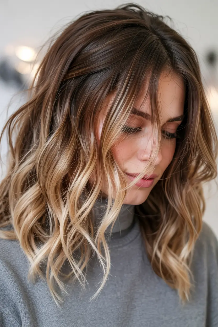 Although brown roots merge with hand-applied blonde highlights, they create a soft transition that makes this effect look effortlessly natural. The shoulder-length cut is paired with soft curls to create a pretty texture that makes the blending more noticeable while adding volume. The combination is easy for blondes and brunettes who want sunny softness while maintaining a brunette look. This style is both versatile and brings out seasonal aesthetic beauty.