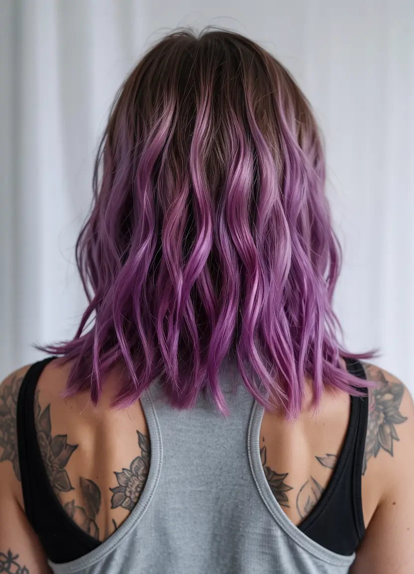 The mix progresses from deep brown at the roots to vibrant purple hues to create a distinctive and controlled bold look. Such lengths help the color transition fully from root to tip while creating an elegant color spectrum. The light reflections on the purple strands are more noticeable due to the proper wave definition. This fashionable color combination is for people who want a sophisticated style with a vibrant look.