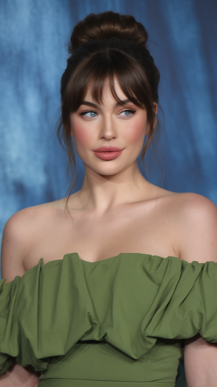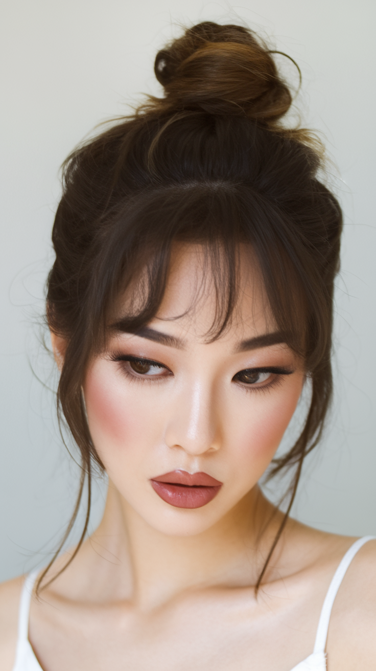 #5 Textured Messy Bun with Soft Curtain Bangs