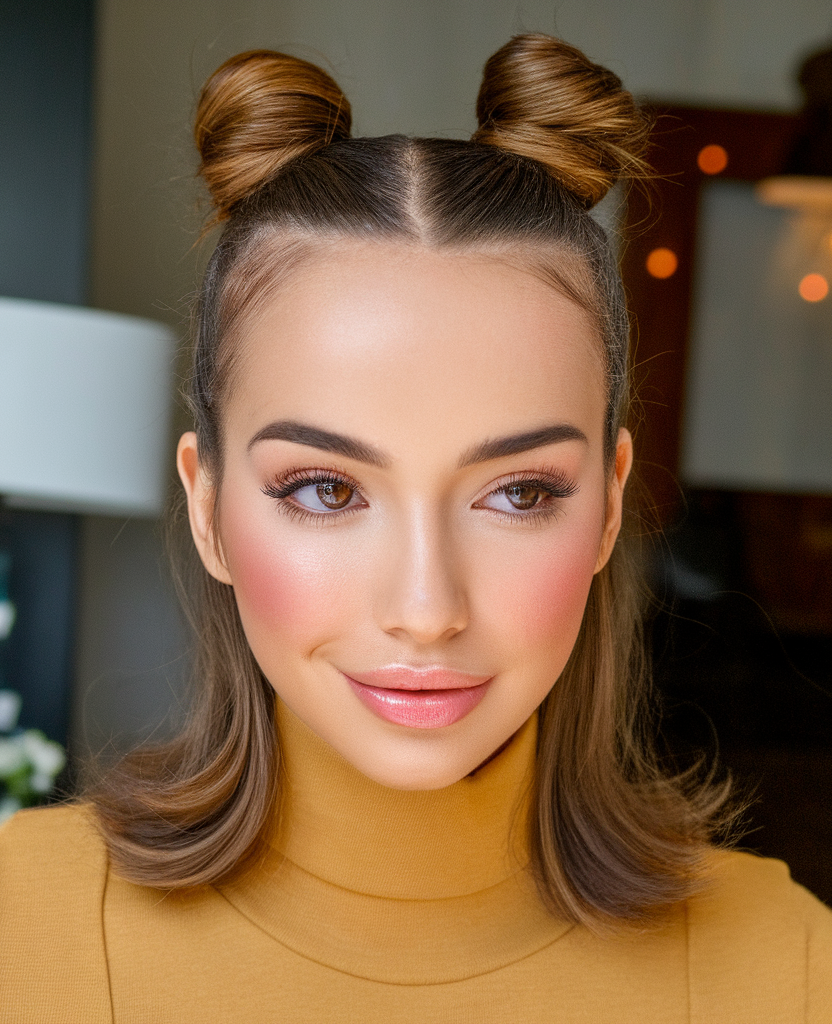 This new take on short hair features two sleek buns positioned high on the head. The bottom sections are left slightly curled for a classy short finish, blending youthful energy with a polished look. Ideal for Halloween, rockstar, or festival-inspired styles, this playful hairstyle adds a modern twist to 2025 trends.