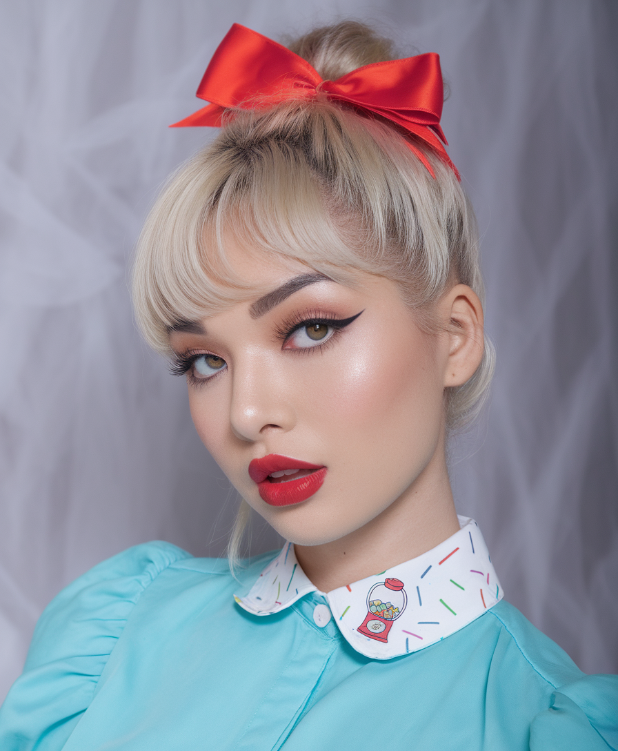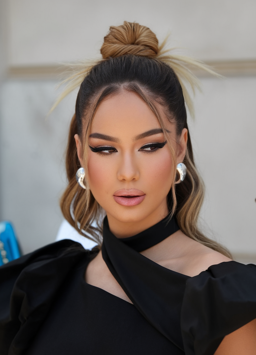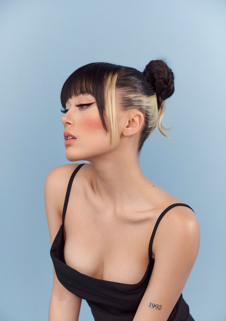This new take on short hair combines a structured bun with sleek, blunt bangs. The contrast between the natural black base and the platinum blonde streaks gives it a bold, rockstar effect. Ideal for Halloween, vampire, or statement fashion looks, this hairstyle redefines edgy glamour.