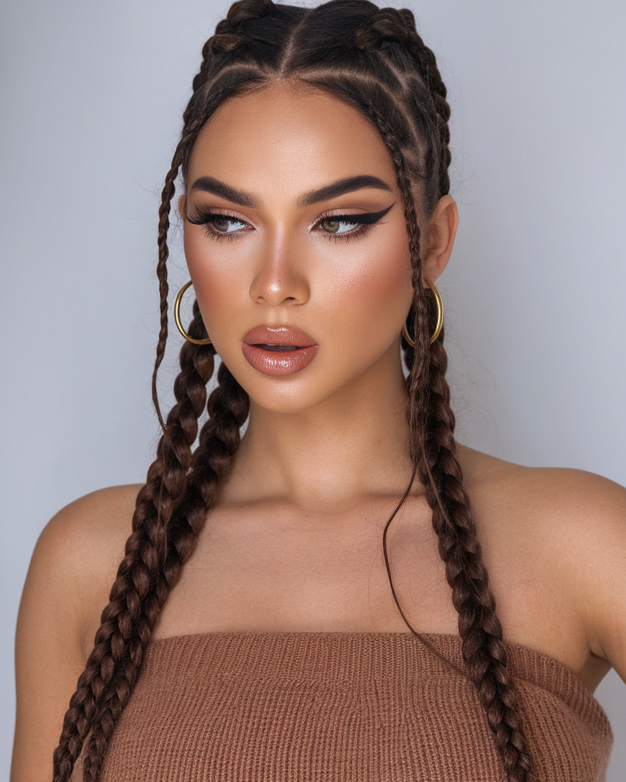 This African-inspired hairstyle showcases bold, structured natural cornrow braids leading into two long locs. The detailed parting and smooth finish create a classy short yet edgy vibe, perfect for rockstar, Lohri, or casual wear. The long locks add versatility, making this a striking 2025 trend.