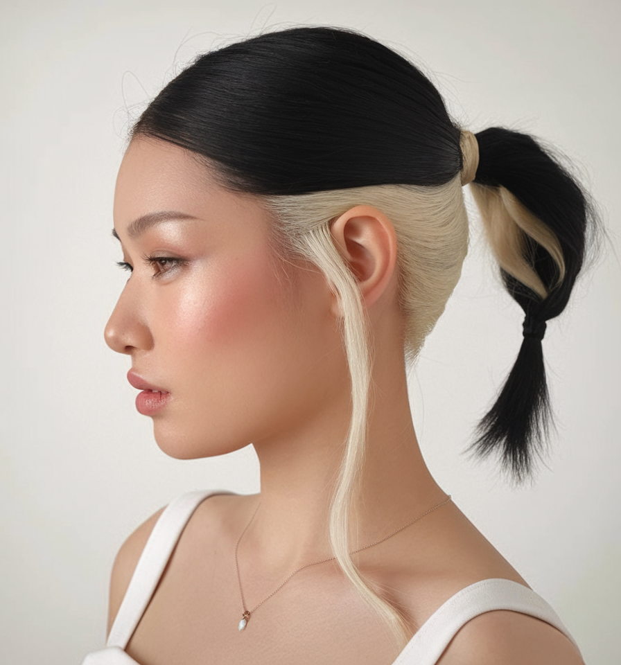 This short hair and long locks combination features a classy short ponytail with a sleek, polished finish. The natural black top layers contrast with the blonde undercut, creating a bold 2025 trend. The tucked-in front sections add a structured effect, making it a versatile choice for both rockstar and business styles.