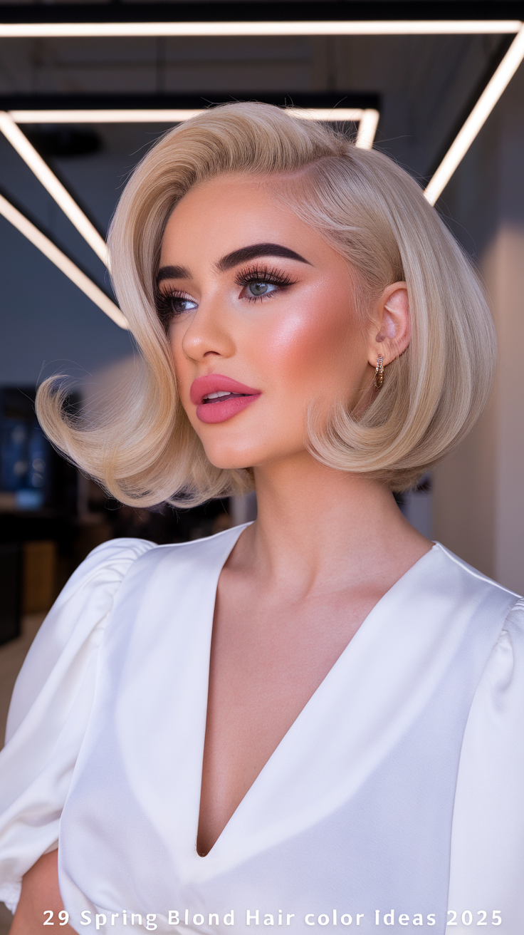 This chic bob is styled with platinum blonde layers that curve gently outward for a modern twist. The soft waves add movement and dimension, making it a standout look for blondes in spring 2025. It’s a versatile option that flatters both fair skin and medium complexions.