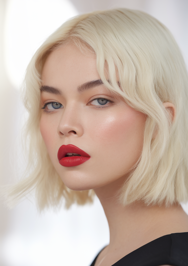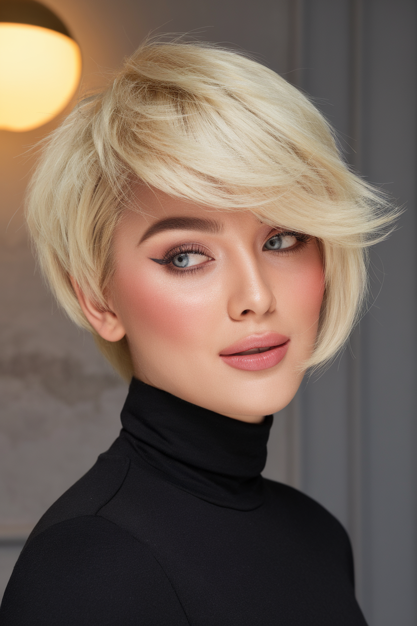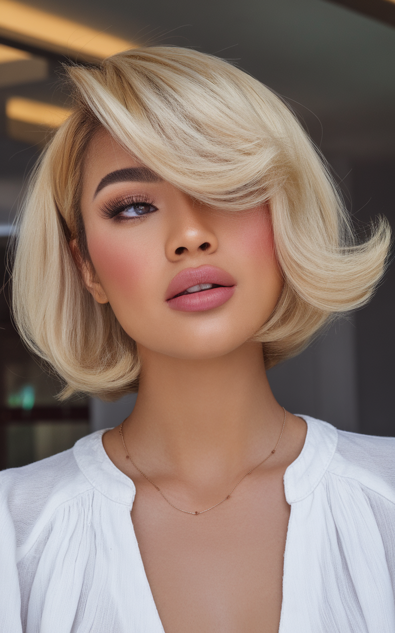 This short bob features a platinum blonde shade with soft layers adding volume and texture. The side-swept bangs enhance the overall look, framing the face beautifully. It’s a stylish, low-maintenance option for spring 2025 that complements fair skin tones.