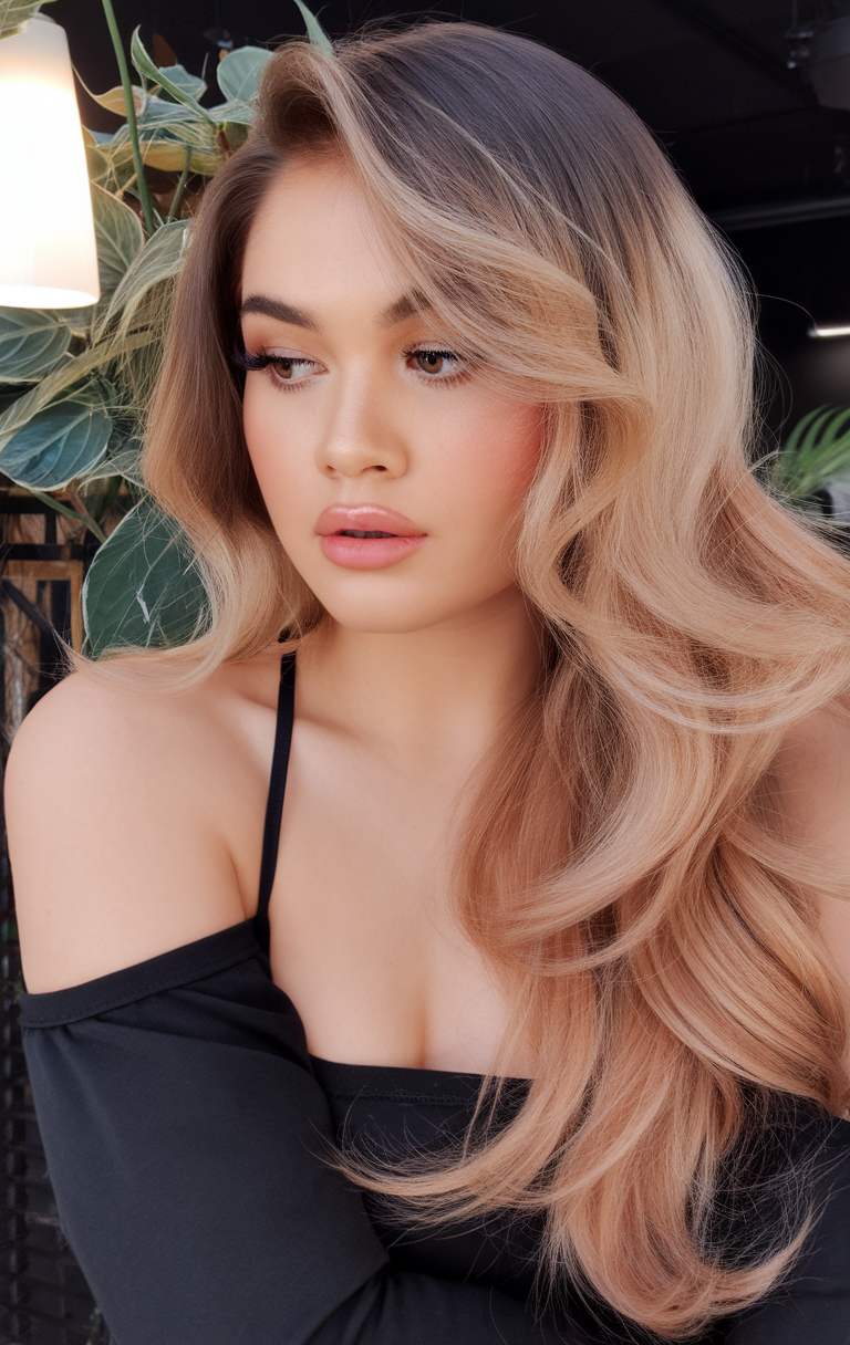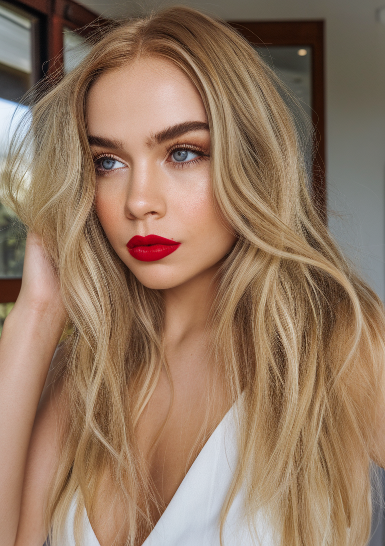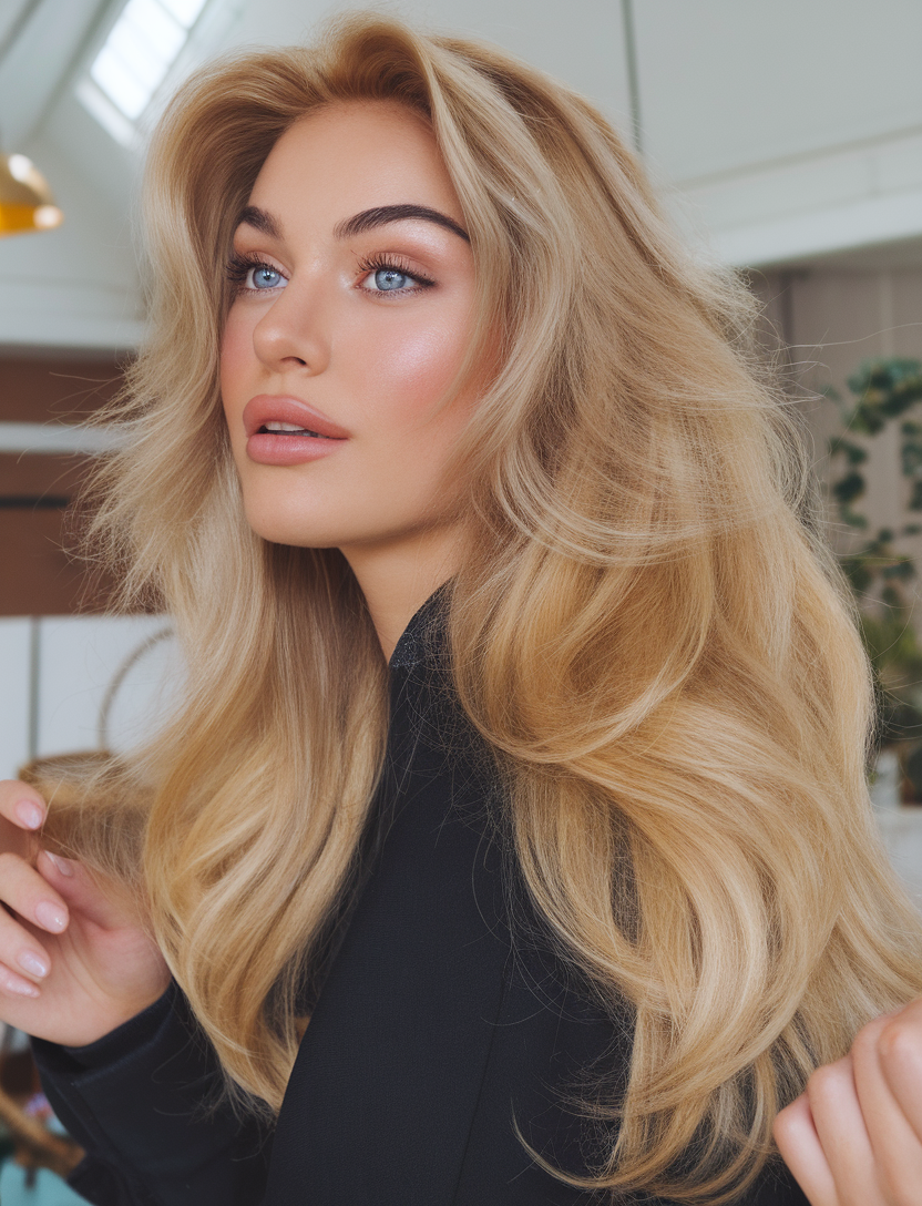 This look combines cascading waves with a caramel honey balayage, blending warm blonde tones into a darker root base. The soft gradient adds depth and movement, making it perfect for brunettes transitioning to blonde. It’s an elegant yet effortless choice for spring blond hair color ideas 2025.