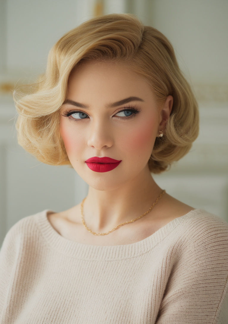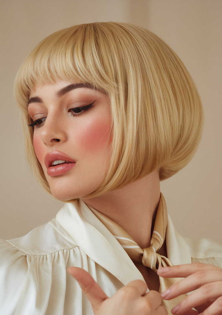 This sleek bob features a golden blonde shade, cut with precision to achieve a rounded shape. The soft bangs frame the face, adding a vintage-inspired elegance to the look. Ideal for spring 2025, this hairstyle enhances fair skin tones and brings out warm undertones.