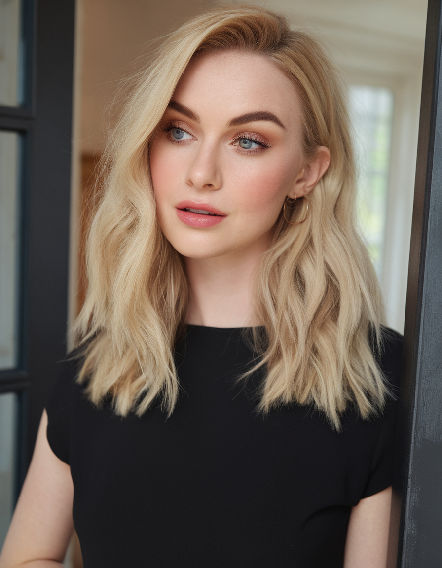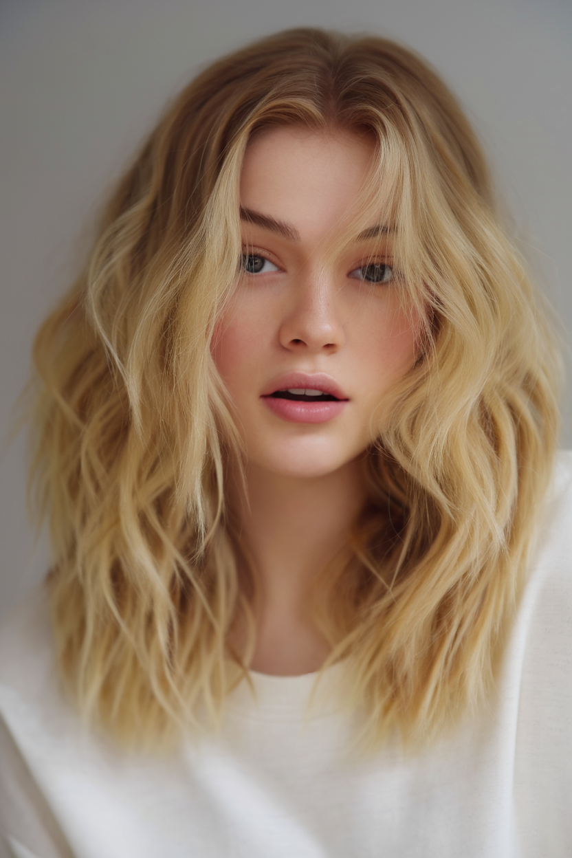 These shoulder-length waves are styled with a dirty blonde base and lighter highlights for added dimension. The tousled texture gives a relaxed, modern vibe that suits the freshness of spring. This versatile cut complements fair skin and pairs well with casual or formal outfits.