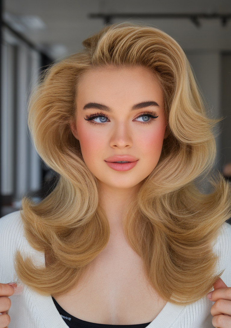 These voluminous waves in a rich honey blonde shade exude a glamorous, retro-inspired vibe. The structured layers create fullness, while the warm blonde tones enhance brightness. Perfect for a bold spring look, this hairstyle pairs beautifully with fair skin tones.