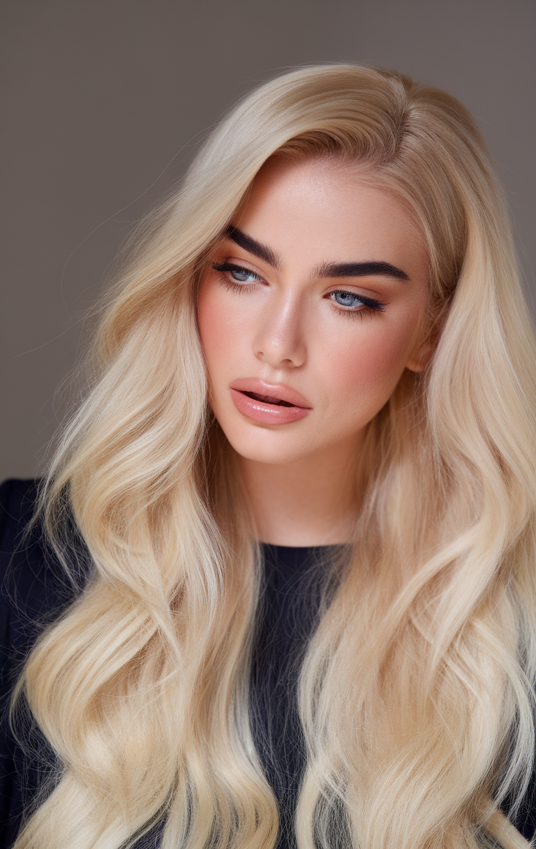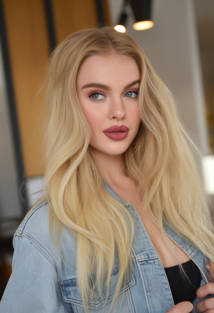 This sleek, straight hairstyle features ash blonde tones that add a cool, refined touch. The long layers create a smooth, polished finish, ideal for spring blond hair color ideas 2025. This look complements fair skin and offers a timeless, sophisticated style.