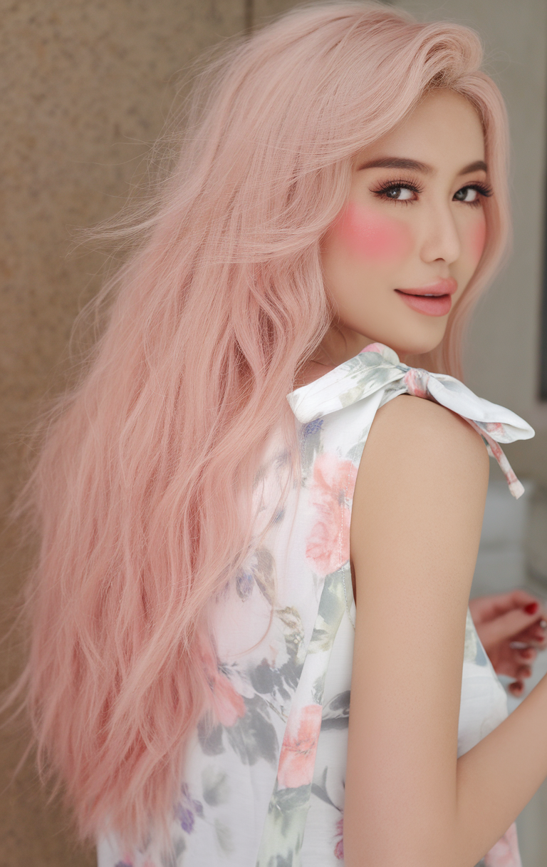 The long, textured waves in a soft pastel pink tone make for a playful and romantic hairstyle. This bold spring color is enhanced by the hair’s voluminous, lightweight texture. Ideal for creating a fresh and unique look, this style suits both fair skin and neutral undertones.