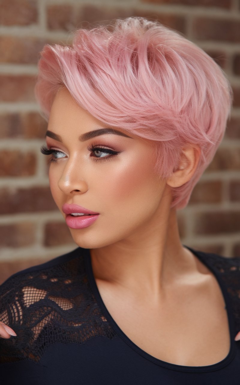 This chic pixie cut showcases a soft pink hue with layered texture for added dimension. The slightly tousled style adds volume and a youthful, modern edge. This daring look is perfect for spring 2025 and complements lighter complexions and bold fashion choices.