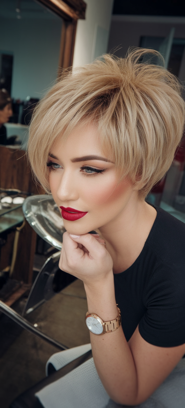 This short blonde pixie cut is styled with feathered layers for maximum volume and texture. The tousled top contrasts with the cropped sides, giving it a modern, edgy flair. The platinum shade highlights the dynamic structure of the cut, perfect for a bold and chic style.