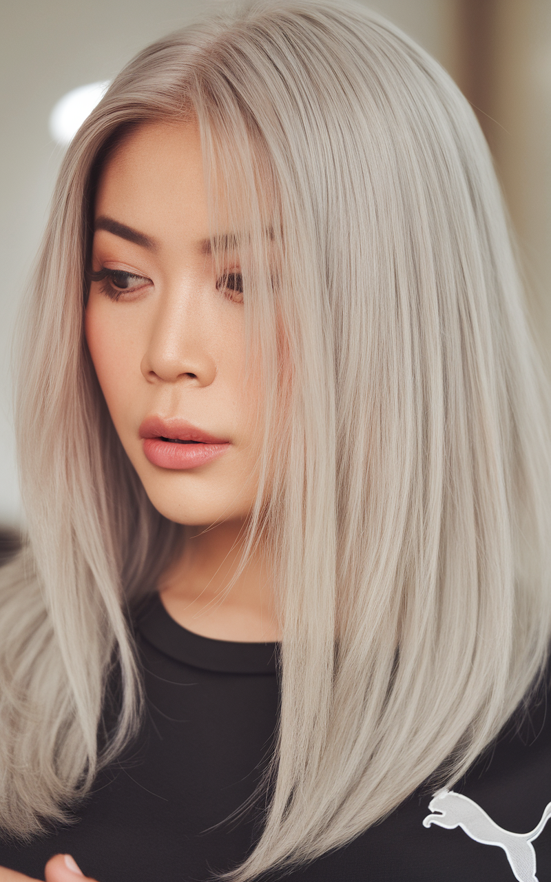 This hairstyle features a cool platinum blonde shade with soft ash undertones. The hair is cut into a precise, medium-length style with slightly layered ends for movement. A center part enhances the sleek and polished look, perfect for showcasing the icy hue.