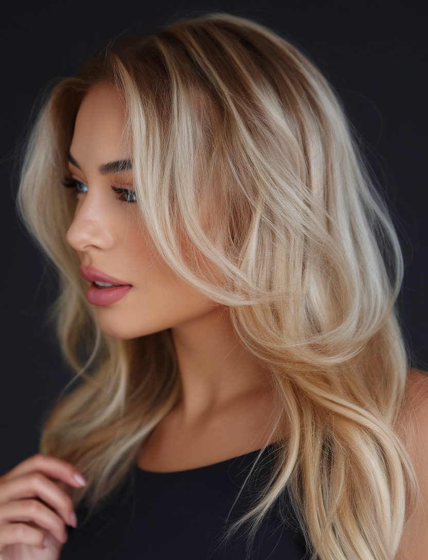 This hairstyle combines long layers with an ash blonde finish and subtle balayage highlights. The natural transition of lighter and darker tones adds depth, making it perfect for medium lengths or longer hair. This look flatters both fair skin and brunette undertones transitioning into blonde.