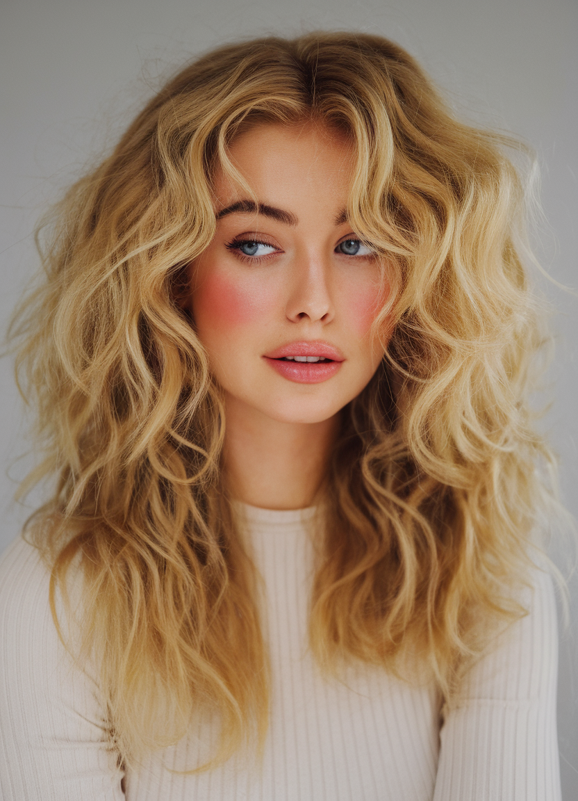 This hairstyle features voluminous curls in a soft dirty blonde shade, perfect for adding texture and movement. The natural blend of darker blonde and lighter highlights creates a dimensional look ideal for spring 2025. These curls are great for medium to longer hair lengths, enhancing both fair skin and warmer undertones.