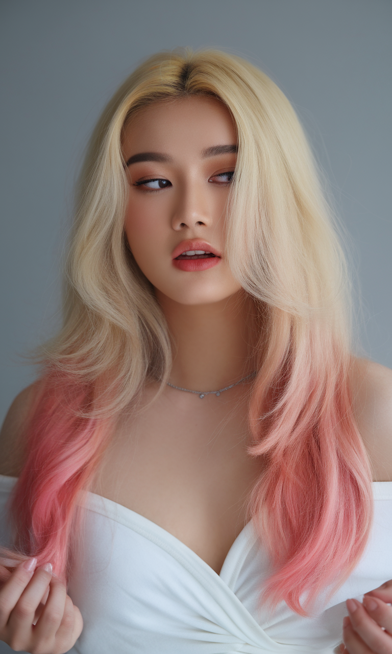 This striking style blends platinum blonde roots with a playful pink ombre effect toward the ends. The layered cut adds texture and movement, making it ideal for those seeking a bold yet feminine look for spring 2025. This vibrant combination works particularly well with fair skin and lighter undertones.