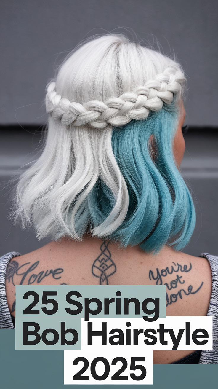 This icy blonde bob transitions into a bold blue ombre, creating a striking contrast. The crown braid blends seamlessly into a center braid, adding texture and depth. The wavy ends enhance movement, making it a unique and trendy spring bob hairstyle 2025.