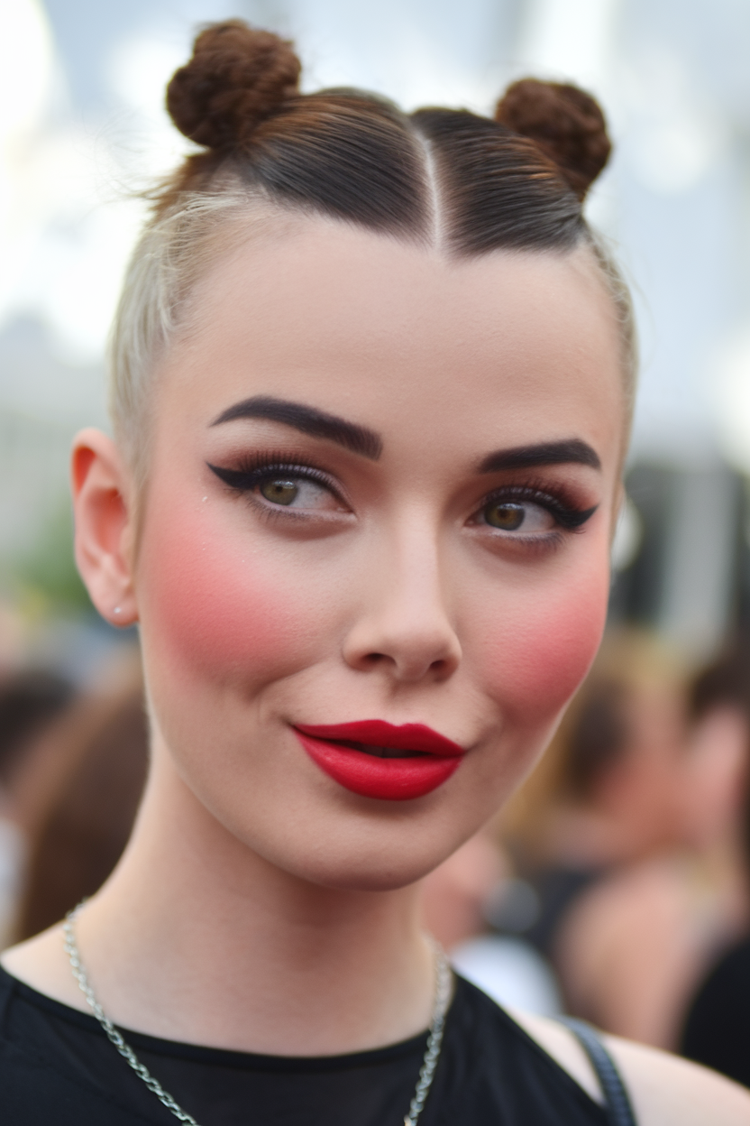 This inverted bob features a sleek front with two small space buns, creating a fun and youthful style. The blonde tone with dark roots adds contrast and depth to the look. Perfect for those who want a bold yet trendy hairstyle with a modern touch.