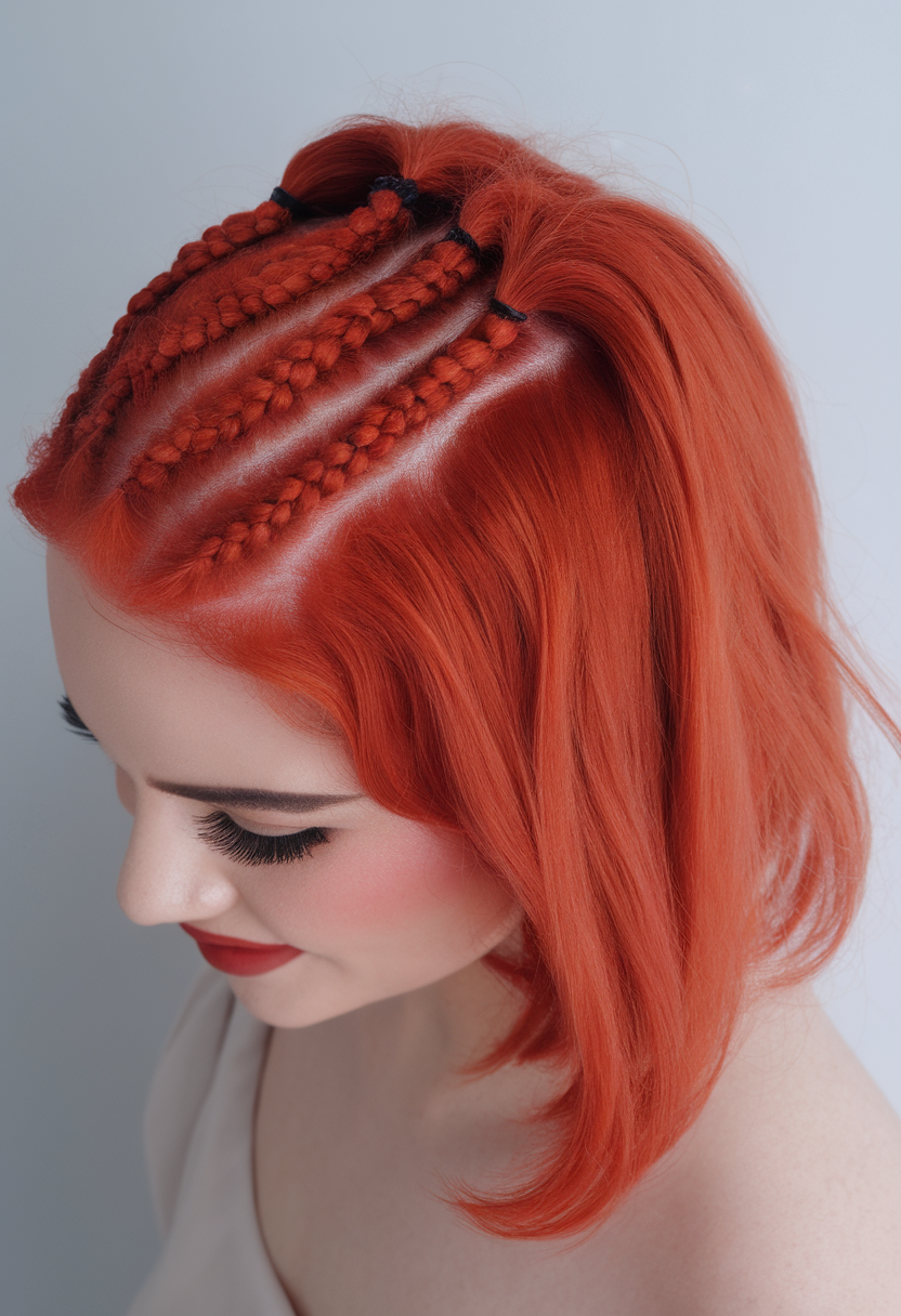 #16 Fiery Red Bob with Braided Top Sections