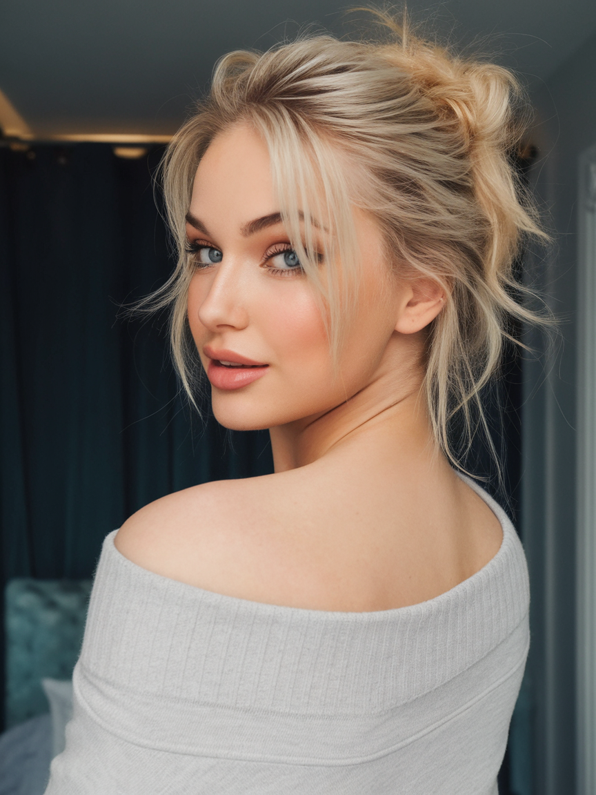 A textured blonde bob styled into a relaxed, messy updo creates an effortless and romantic feel. Soft face-framing strands add movement, while the volume at the crown gives a natural lift. This style is perfect for those who love a casual yet chic spring look.