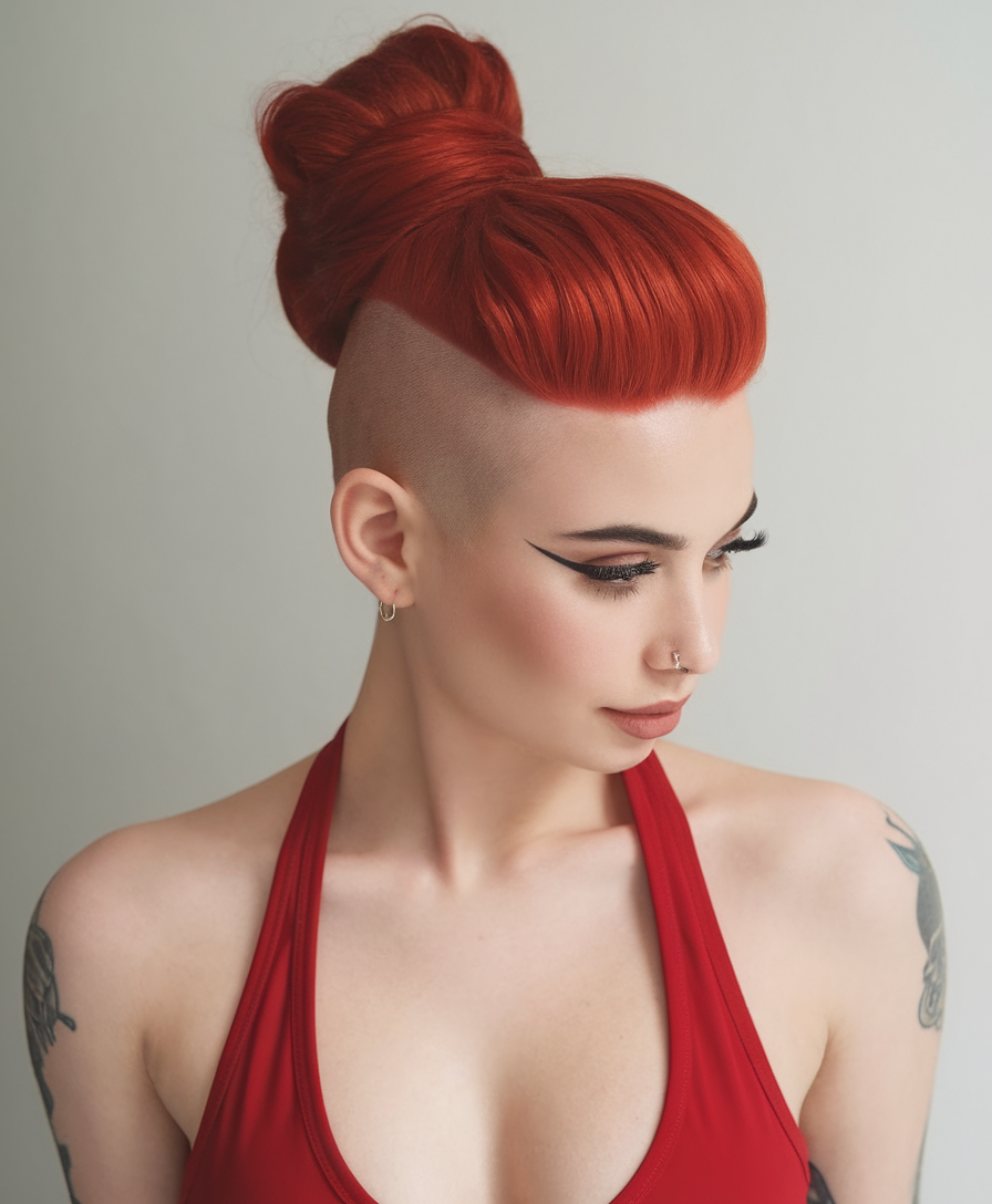 This bold undercut bob transitions into a structured, voluminous high bun for a striking contrast. The fiery red hue enhances the edgy appeal, making it a standout choice for daring styles. The clean-shaven sides highlight the dramatic height of the updo.