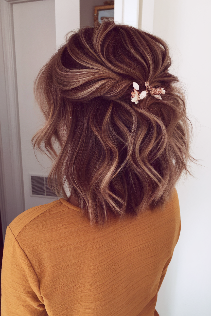 This shoulder-length wavy bob features warm brunette tones with subtle highlights for added dimension. The half-up twisted section is secured with a delicate floral pin, creating a soft and romantic look. Loose waves enhance the texture, making it a perfect choice for a relaxed yet polished style.