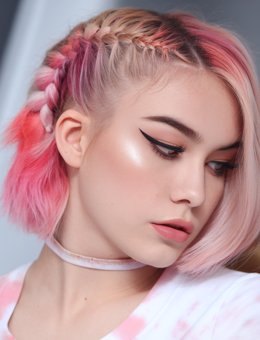 This blunt bob blends platinum blonde and pastel pink hues, creating a seamless ombre effect. The tight French braids along the sides add structure while leaving the ends loose for a playful finish. A bold and trendy take on the spring bob hairstyle 2025 trend.