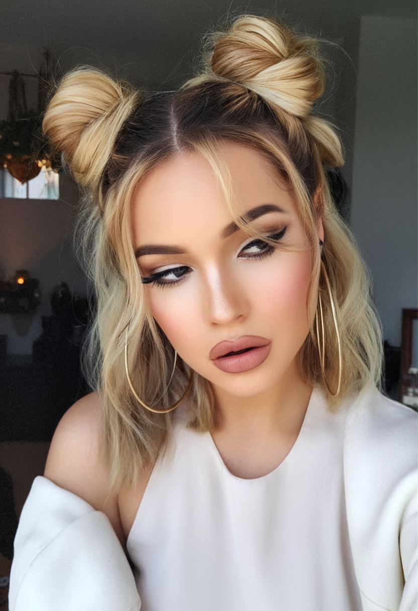 A textured blonde bob styled into playful space buns gives this look a fun and youthful feel. The dark roots blend into soft blonde waves, adding contrast and depth. This style is ideal for those who want a trendy yet casual spring bob hairstyle.