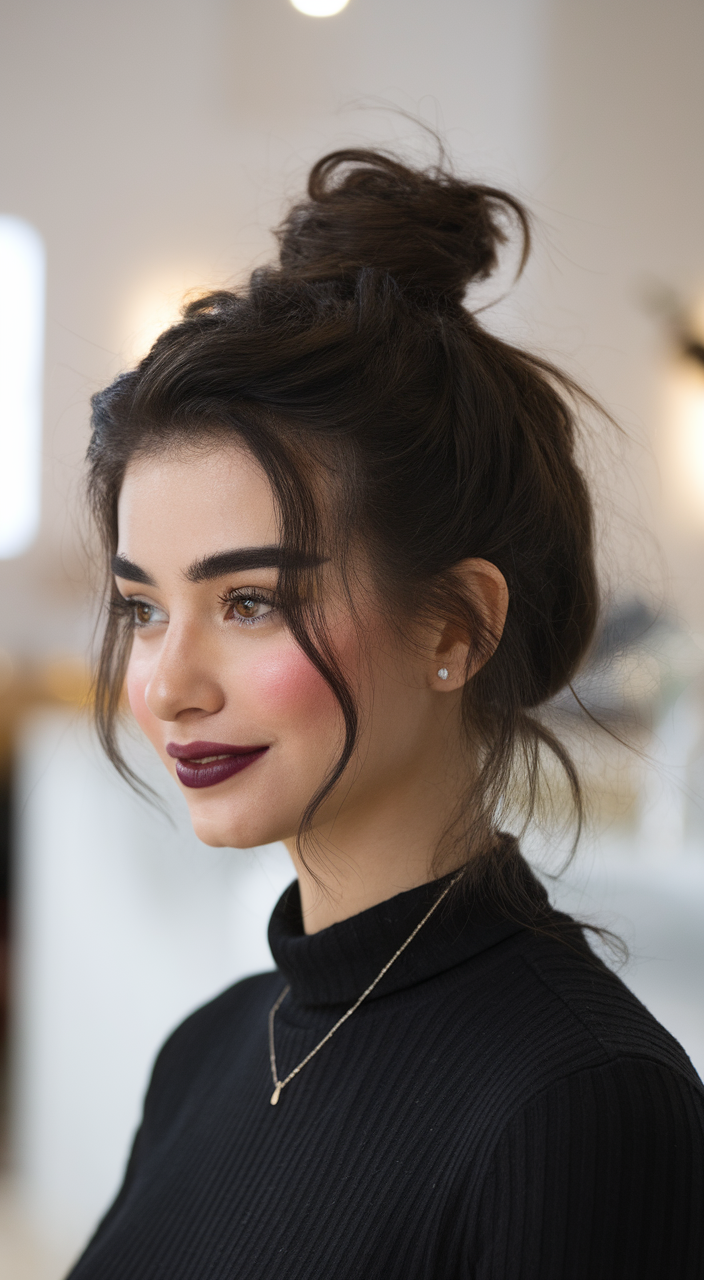 This dark brunette bob is styled into a textured high bun, creating a voluminous and effortless look. Loose face-framing strands soften the style, adding a romantic and relaxed touch. Ideal for those who love a low-maintenance yet chic updo.