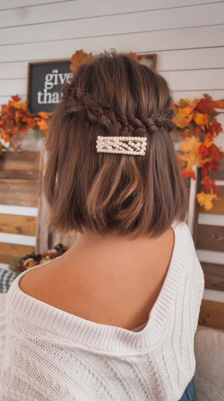 A medium-length layered bob with a soft, natural finish gives a light and effortless feel. The braided crown adds a touch of elegance and works well for both casual and formal occasions. A pearl-embellished clip completes the look, making it chic and stylish.