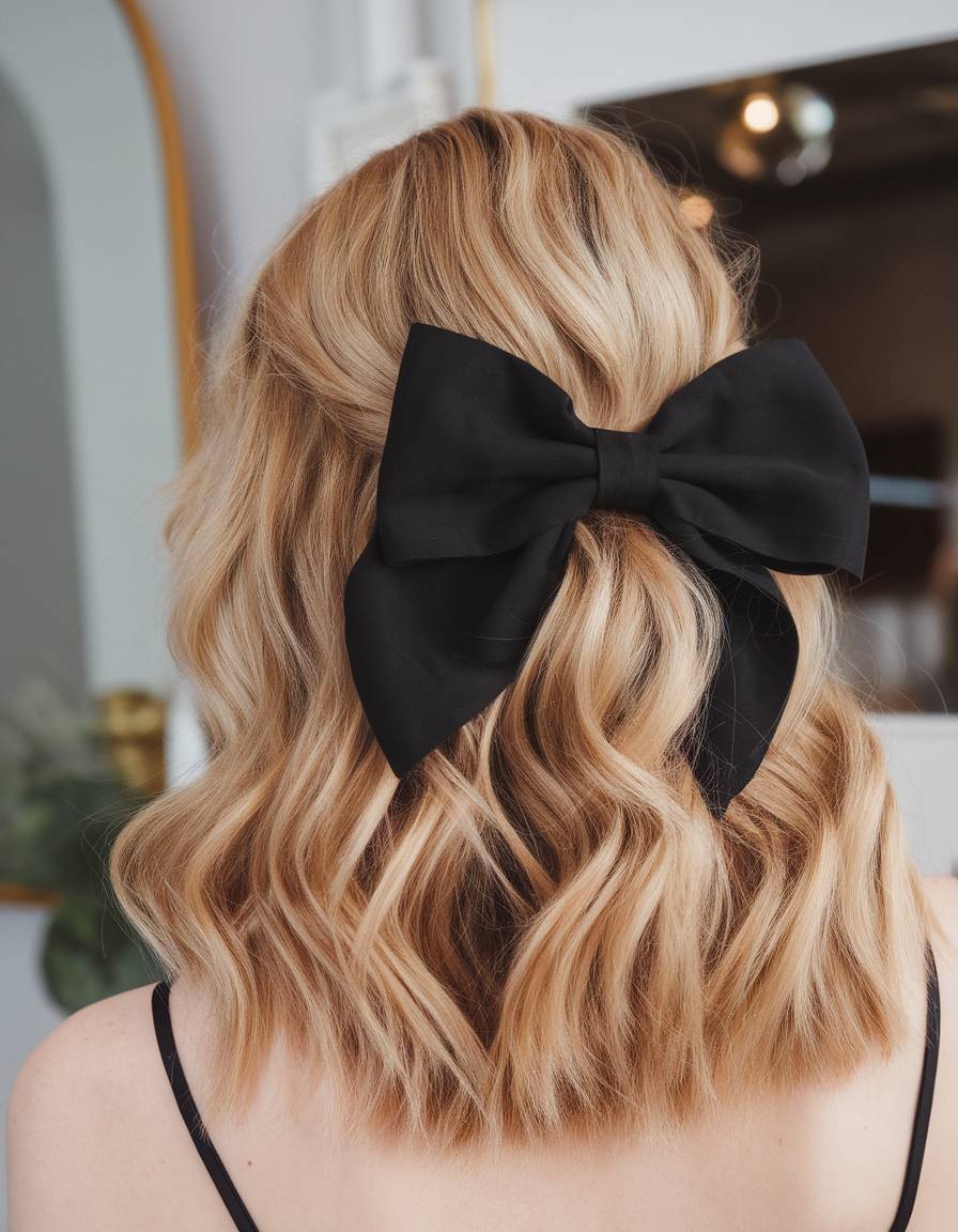 A soft wavy bob with natural blonde highlights is styled into a half-up look, secured with an oversized black bow. The waves add texture and movement, making the hairstyle feel light and effortless. This look is perfect for adding a touch of elegance to a classic bob.