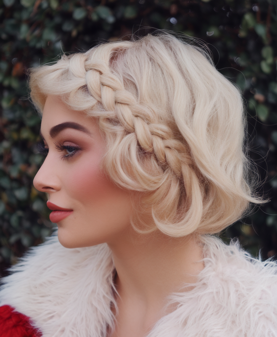 This soft blonde bob features a deep side part with a loose, chunky braid woven along the front. The structured waves add volume, creating a classic yet modern vintage-inspired look. A perfect option for those who love an elegant yet effortless style.