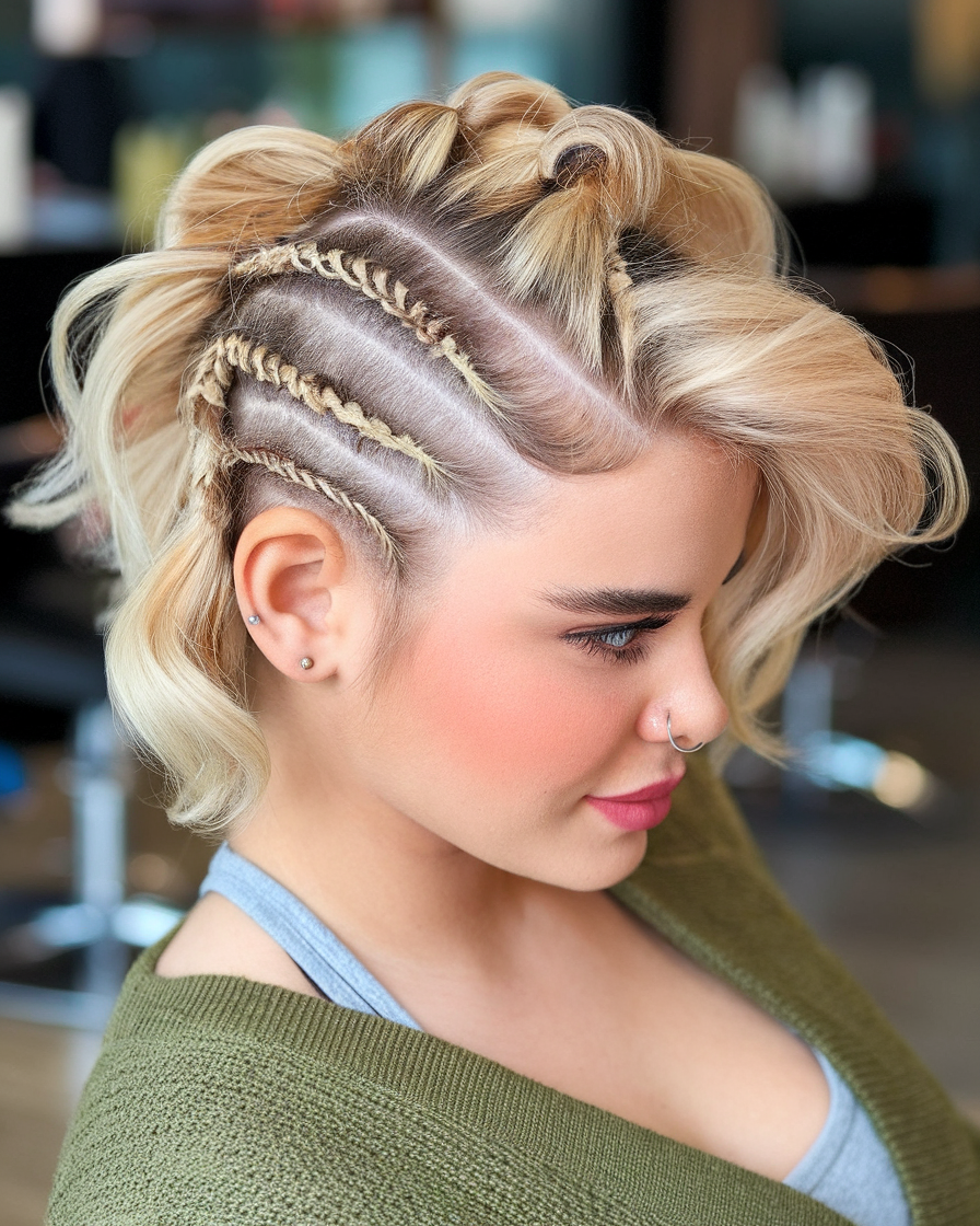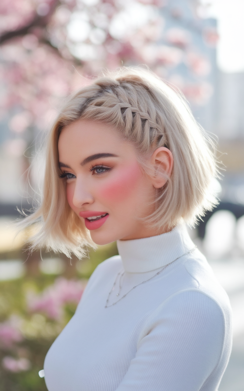 This short wavy bob is styled with tight side braids that contrast with the voluminous waves on the other side. The platinum blonde hue enhances the edgy yet feminine appeal of this style. A bold and modern take on the spring bob hairstyle 2025 trend.