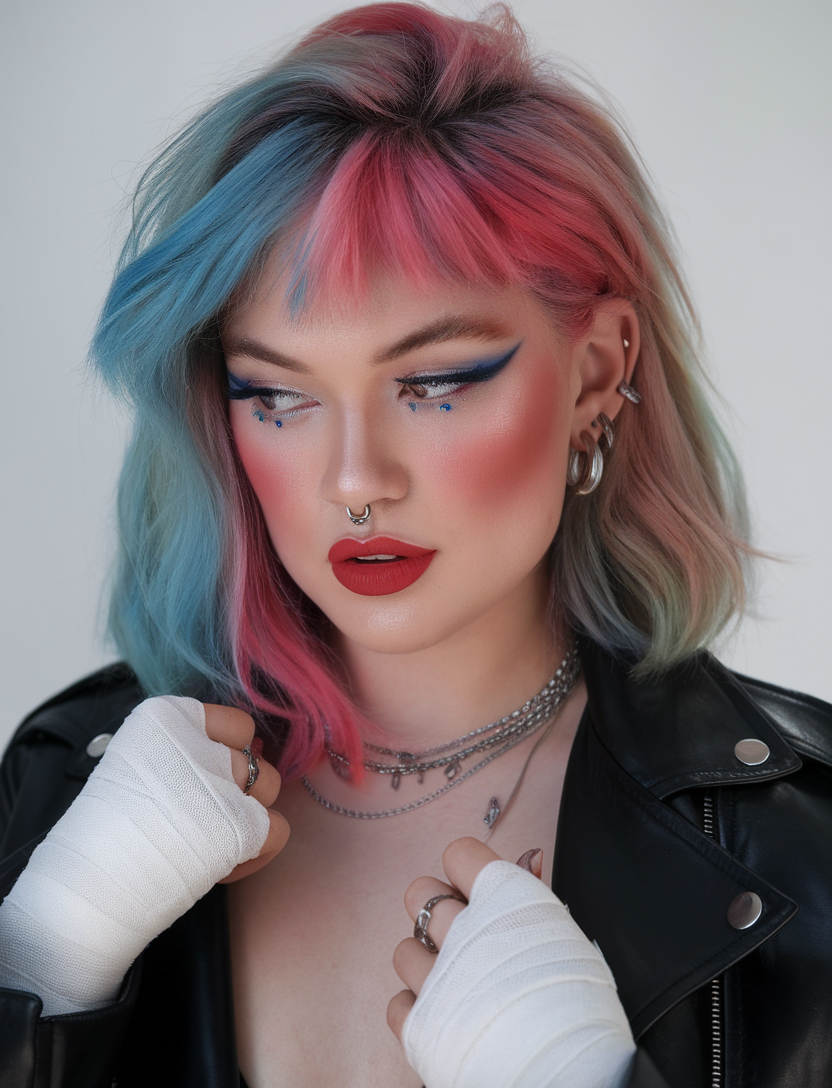 This bold bob features a split-dyed color with vibrant pink and blue hues. The choppy bangs and tousled layers add an edgy, modern feel to the look. A great choice for those who love daring and unconventional hairstyles.