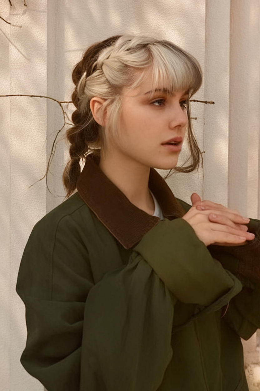 This short bob is styled into two structured braids, giving it a youthful and playful feel. The soft curtain bangs frame the face, blending seamlessly into the style. The contrast between the dark and blonde tones adds extra dimension.