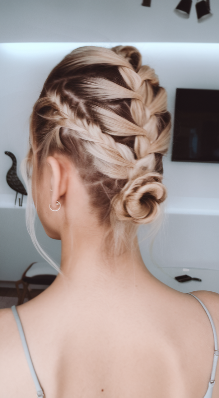 This blonde bob is styled into two structured French braids leading into a small, sleek bun. The contrast between the tight braids and smooth finish creates a modern and edgy look. Perfect for those who prefer a low-maintenance yet stylish updo.
