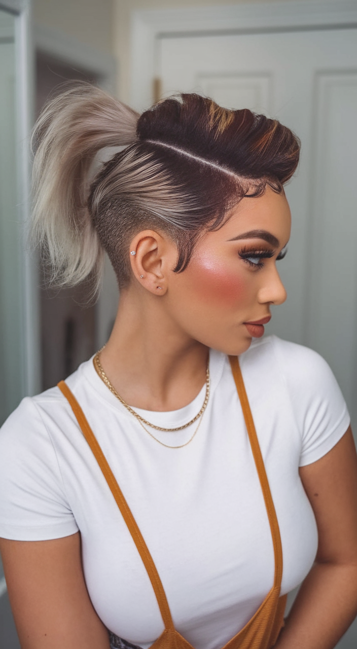 A bold undercut bob paired with a voluminous high ponytail gives this hairstyle a striking appearance. The dark roots seamlessly blend into the icy blonde tones, creating depth and dimension. The sleek side styling and sharp fade add a modern and trendy touch.