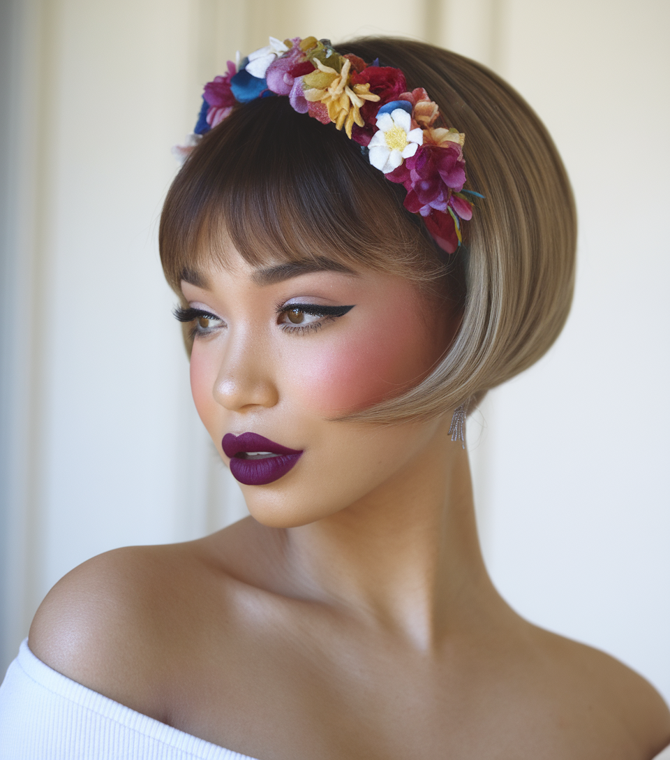 This smooth and polished bob features a rounded shape with a slight inward curve at the ends. The blunt bangs frame the face perfectly, adding softness and elegance. A floral headband enhances the look, making it a chic choice for spring.