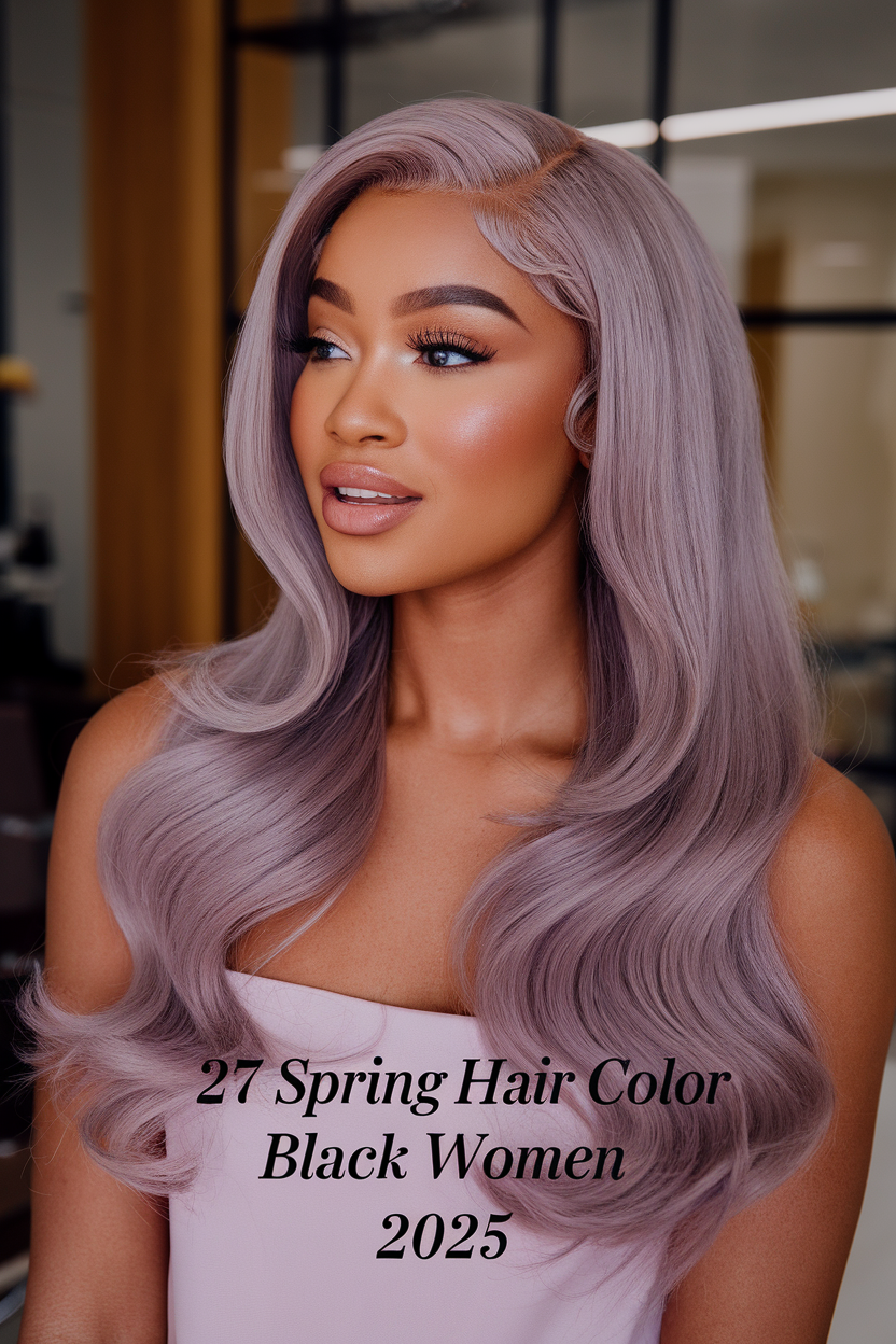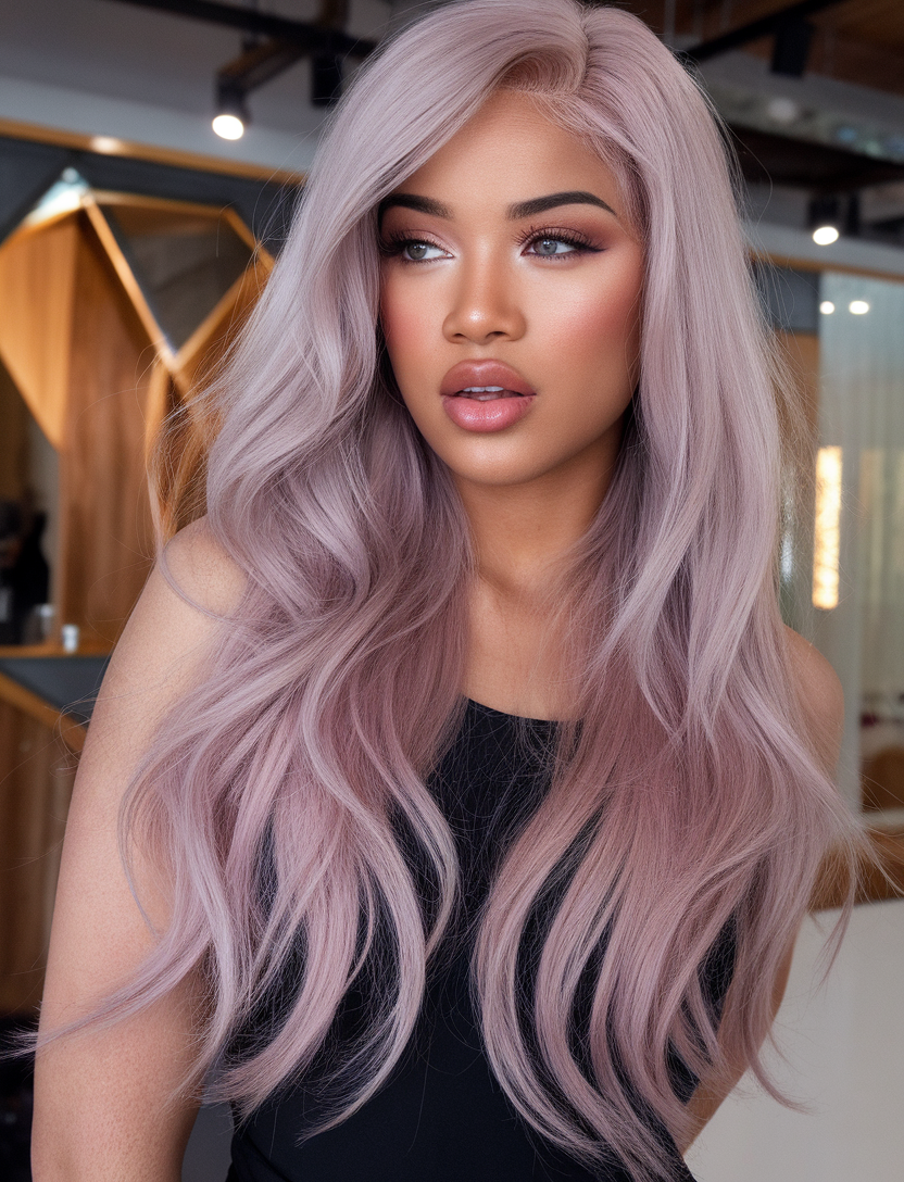 This stunning dyed wig features a soft light lavender shade, blending subtle pastel tones for a dreamy spring look. The voluminous waves add texture, making it ideal for Tone women who love unique, creative styles. This hue works beautifully with blue undertones, offering a striking yet delicate finish. A modern take on spring hair color for Black women 2025 that feels fresh and inspired.
